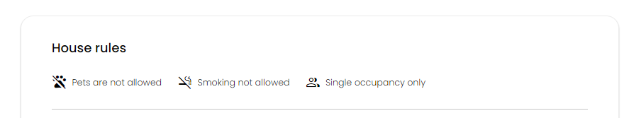 - Rauchen erlaubt: Dies zeigt an, ob das Rauchen in der Unterkunft erlaubt ist oder nicht. Wir empfehlen dringend, diese Regel zu befolgen, sonst können Sie riskieren, Ihre Kaution zu verlieren
