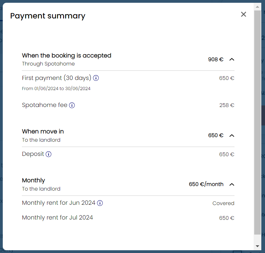 Depois de inserir as datas desejadas na página da propriedade, você poderá ver o cronograma de pagamento completo, que inclui a taxa de reserva da Spotahome, o depósito, o aluguel mensal e quaisquer taxas de administração cobradas pelo proprietário.